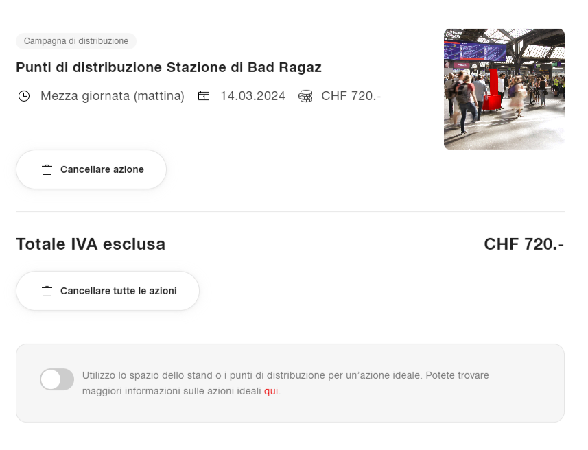 La prenotazione di promozioni a scopo non lucrativo avviene tramite ricerca e selezione dei normali prodotti. Alla chiusura della prenotazione in Selezione, è possibile attivare l’opzione «Utilizzo lo spazio dello stand o i punti di distribuzione per una campagna a scopo non lucrativo». I prezzi si allineano di conseguenza. (Le campagne di distribuzione a scopo non lucrativo non richiedono pagamenti; per le campagne con stand a scopo non lucrativo si applica una tassa amministrativa di 90 franchi.)